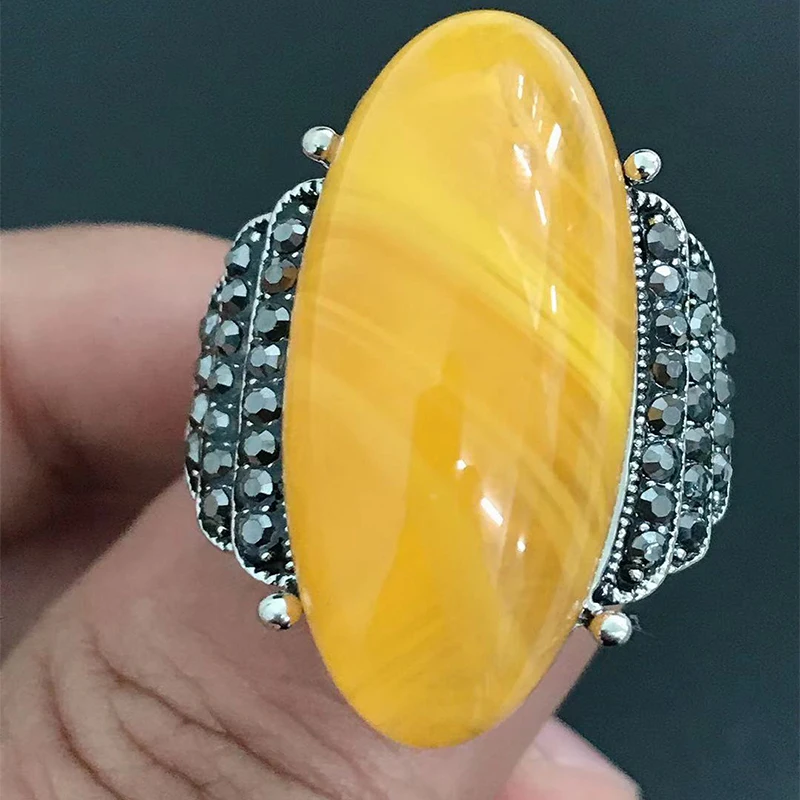 Name: Anillos de boda de compromiso de estilo étnico para mujer, joyas grandes ovaladas de piedra amarilla/verde para mujer, sortija de circonita brillante rellena Vintage